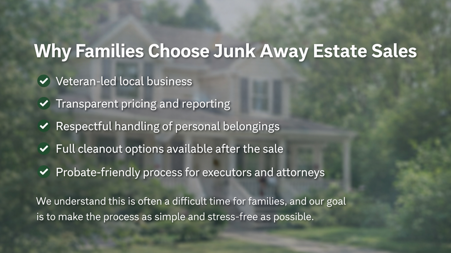 We stage, price, advertise, and run the entire sale so families don’t have to handle the logistics themselves.